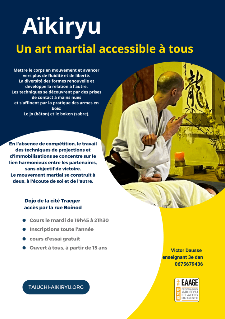 Cours d’Aïkiryu, le mardi de 19h30 à 22h00.